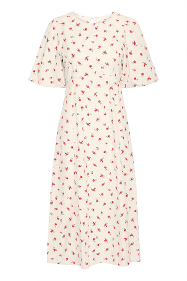 - OBS! Fjernlager. Levering kan blive forlænget med 2-3 dage, hvis varen ikke findes i vores butik lige nu.Sød kjole fra Ichi med ½ lange ærmer, rund hals og en dyb udskæring i ryggen der lukkes med en smal bindesnor.