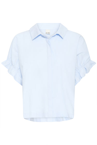 OBS! Fjernlager. Levering kan blive forlænget med 2-3 dage, hvis varen ikke findes i vores butik lige nu.Feminin skjorte fra Ichi med korte pufærmer, en lille krave i halsen og en smart elastikdetalje i ryggen.