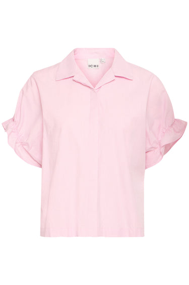 OBS! Fjernlager. Levering kan blive forlænget med 2-3 dage, hvis varen ikke findes i vores butik lige nu.Feminin skjorte fra Ichi med korte pufærmer, en lille krave i halsen og en smart elastikdetalje i ryggen.