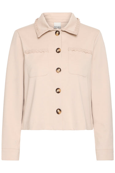 OBS! Fjernlager. Levering kan blive forlænget med 2-3 dage, hvis varen ikke findes i vores butik lige nu.Smart jakke fra Ichi med lange ærmer, krave i halsen og fine lommer med flæsedetaljer på brystet.