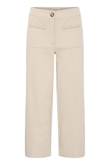 - OBS! Fjernlager. Levering kan blive forlænget med 2-3 dage, hvis varen ikke findes i vores butik lige nu.Flotte bukser fra Ichi med høj talje, cropped længde og et straight-leg snit.