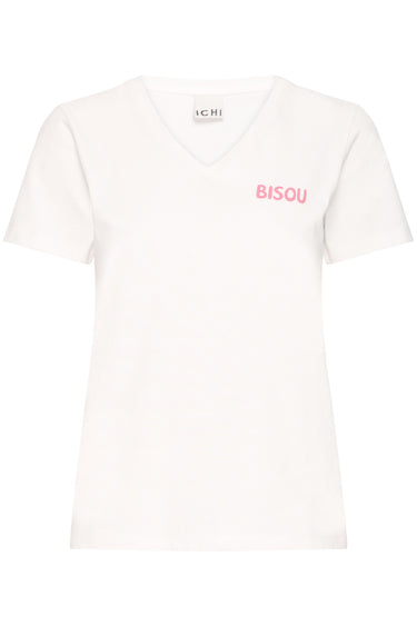 - OBS! Fjernlager. Levering kan blive forlænget med 2-3 dage, hvis varen ikke findes i vores butik lige nu.Smart tee fra Ichi med korte ærmer, v-udskæring i halsen og et cool print på ryggen og brystet.