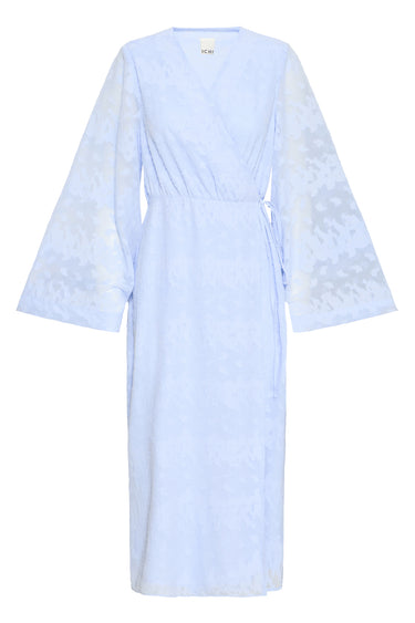 OBS! Fjernlager. Levering kan blive forlænget med 2-3 dage, hvis varen ikke findes i vores butik lige nu.Smuk kjole fra Ichi med lange brede ærmer, v-udskæring og en fin slå-om effekt der bindes i siden.