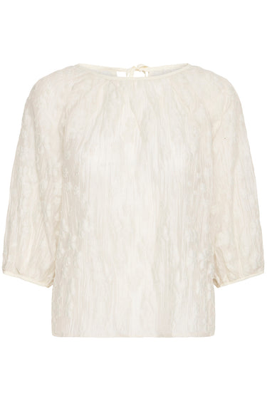 OBS! Fjernlager. Levering kan blive forlænget med 2-3 dage, hvis varen ikke findes i vores butik lige nu.Feminin bluse fra Ichi med ¾ lange ærmer, bådudskæring i halsen og en smuk kvalitet.