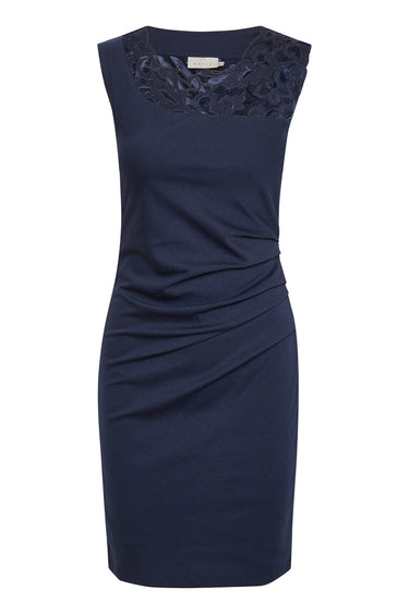 OBS! Fjernlager. Levering kan blive forlænget med 2-3 dage, hvis varen ikke findes i vores butik lige nu.Smuk kjole fra Kaffe med rund hals, draperet effekter i siden og en tætsiddende silhuet.Kjolen har også de flotteste broderet blonde detaljer over brystet og et super fint feminint udtryk.