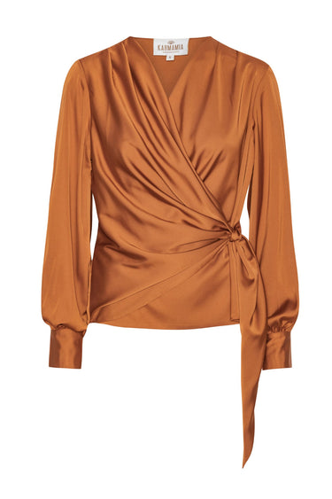 Feminin og stilren bluse fra Karmamia med lange ærmer og en smuk draperet effekt der bindes i siden og fremhæver din figur. Blusen har også brede manchetter omkring håndleddene og en dejlig blød kvalitet.