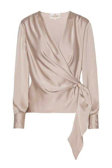 Feminin og stilren bluse fra Karmamia med lange ærmer og en smuk draperet effekt der bindes i siden og fremhæver din figur. Blusen har også brede manchetter omkring håndleddene og en dejlig blød kvalitet.