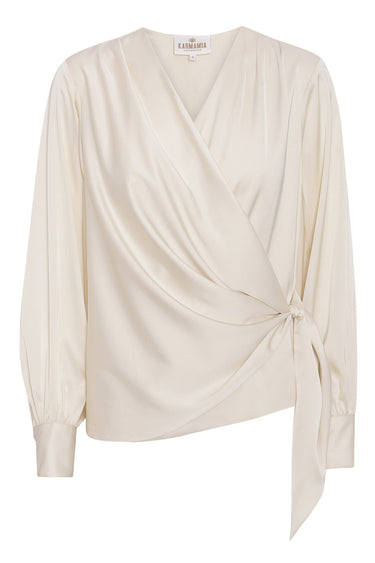 Elegant bluse fra Karmamia med lange ærmer og v-hals. Blusen har et smukt draperet og asymmetrisk snit samt let puffede ærmer med brede manchetter.