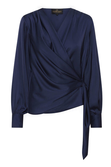 Elegant bluse fra Karmamia med lange ærmer og v-hals. Blusen har et smukt draperet og asymmetrisk snit samt let puffede ærmer med brede manchetter.