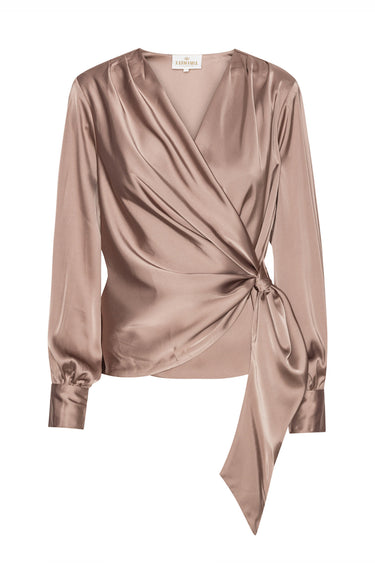 Elegant bluse fra Karmamia med lange ærmer og v-hals. Blusen har et smukt draperet og asymmetrisk snit samt let puffede ærmer med brede manchetter.