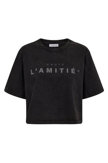 OBS! Fjernlager. Levering kan blive forlænget med 2-3 dage, hvis varen ikke findes i vores butik lige nu.Smart cropped tee fra Haute L'Amitié med korte ærmer, rund hals og et fint logo på brystet.