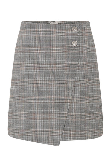 OBS! Fjernlager. Levering kan blive forlænget med 2-3 dage, hvis varen ikke findes i vores butik lige nu.Elegant nederdel fra Bruuns Bazaar med et asymmetrisk snit, smukke dekorative knapper og et fint ternet print.