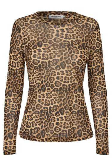Elegant mesh bluse fra Lollys Laundry med lange ærmer, rund halsudskæring og et skønt leopardprint i naturlige farver.