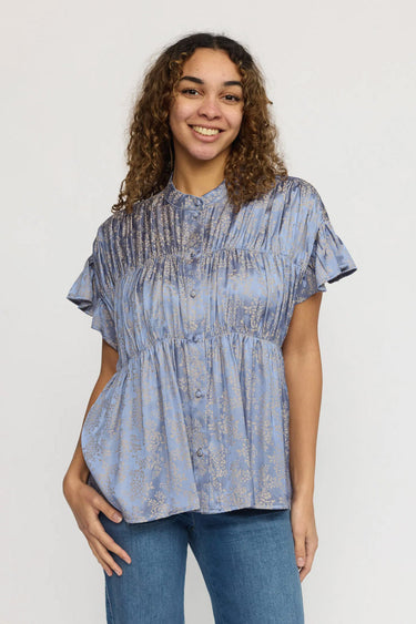 - OBS! Fjernlager. Levering kan blive forlænget med 2-3 dage, hvis varen ikke findes i vores butik lige nu.Smuk skjortebluse fra 2-Biz med korte flæseærmer, kinakrave i halsen og flotte beklædte knapper langs fronten.Blusen har også super fine detaljer og en elegant jacquard kvalitet.