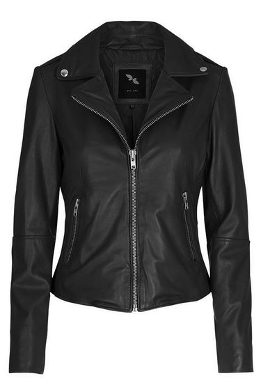 Bikerjakke i blødt læder. Lukkes med lynlås. Jakken kan bruges med åben krave eller lukket helt til. 2 sidelommer med lynlås og en inderlomme. Dekorativ skulderstrop og lynlås for enden af ærmerne for ekstra vidde.- Pasform: Alm