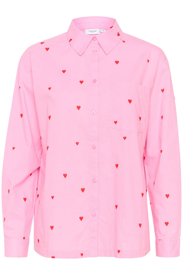 OBS! Fjernlager. Levering kan blive forlænget med 2-3 dage, hvis varen ikke findes i vores butik lige nu.Skøn skjortebluse fra Saint Tropez med lange ærmer, krave i halsen og det skønneste mønster med små fine hjerter.