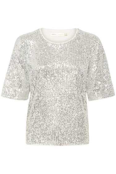 OBS! Fjernlager. Levering kan blive forlænget med 2-3 dage, hvis varen ikke findes i vores butik lige nu.Smuk pailletbluse fra InWear med ½ lange ærmer, rund hals og en smart boxy pasform.