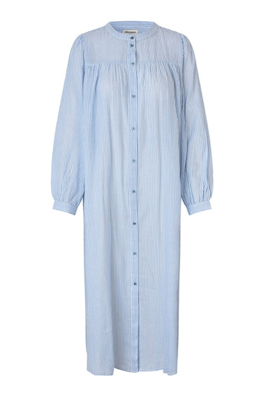 OBS! Fjernlager. Levering kan blive forlænget med 2-3 dage, hvis varen ikke findes i vores butik lige nu.Smart skjortekjole fra Lollys Laundry med lange pufærmer, kinakrave i halsen og knaplukning langs fronten.