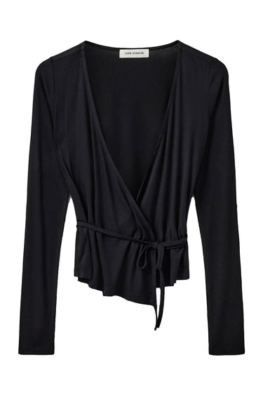 - OBS! Fjernlager. Levering kan blive forlænget med 2-3 dage, hvis varen ikke findes i vores butik lige nu.Fin slå-om bluse fra Sofie Schnoor med lange ærmer, dyb v-udskæring i halsen og et smalt bindebånd i taljen.