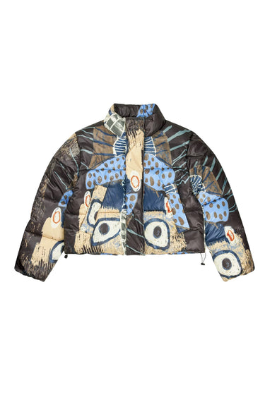 OBS! Fjernlager. Levering kan blive forlænget med 2-3 dage, hvis varen ikke findes i vores butik lige nu.En elegant, kort pufferjakke med et smukt all-over kunstprint. Jakken er designet med lommer, en skjult knaplukning og kan justeres med en snorelukning forneden.