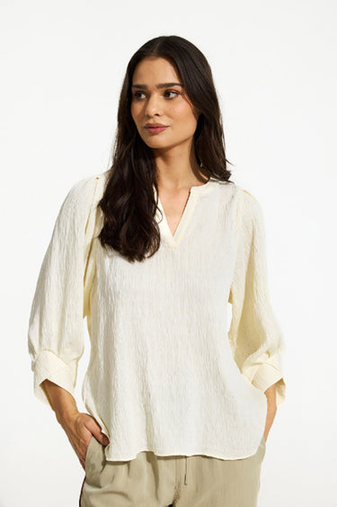 OBS! Fjernlager. Levering kan blive forlænget med 2-3 dage, hvis varen ikke findes i vores butik lige nu.Fin bluse fra In Front med ¾ lange ærmer, rund hals med v-udskæring og en fin struktureret kvalitet.