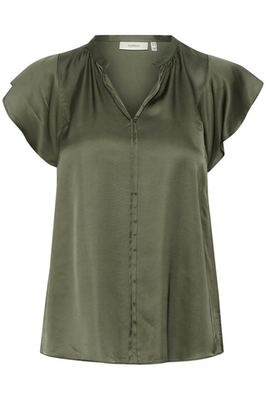 OBS! Fjernlager. Levering kan blive forlænget med 2-3 dage, hvis varen ikke findes i vores butik lige nu.Sød bluse fra InWear med små ærmer, v-udskæring i halsen og fine knapper langs fronten.
