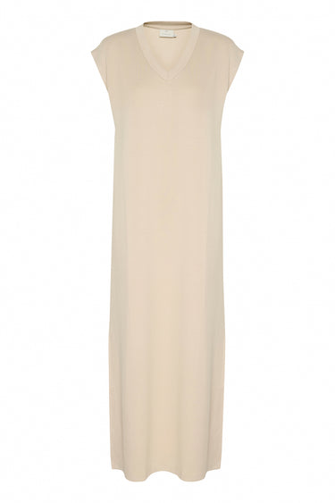 OBS! Fjernlager. Levering kan blive forlænget med 2-3 dage, hvis varen ikke findes i vores butik lige nu.Helt enkel maxi kjole fra Kaffe med v-udskæring i halsen og slidser i siderne.