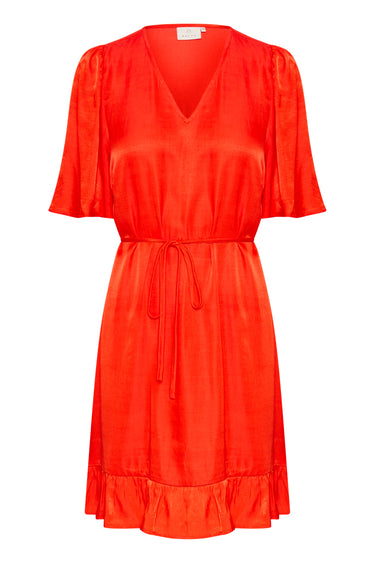 OBS! Fjernlager. Levering kan blive forlænget med 1-2 dage, hvis varen ikke findes i vores butik lige nu.Elegant kjole fra Kaffe ½ lange ærmer, v-udskæring i halsen og et smalt bindebælte i taljen.Kjolen har også en bred flæsekant i bunden af skørtet og den smukkeste kvalitet.