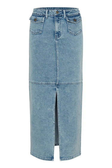 - OBS! Fjernlager. Levering kan blive forlænget med 2-3 dage, hvis varen ikke findes i vores butik lige nu.Cool denim nederdel fra Kaffe med slids i fronten og super smarte lommer foran.