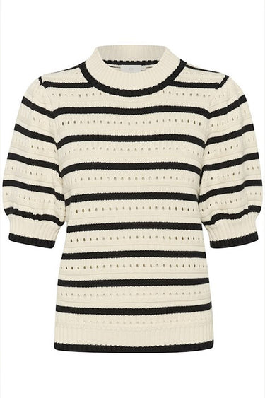 OBS! Fjernlager. Levering kan blive forlænget med 2-3 dage, hvis varen ikke findes i vores butik lige nu.Sød strik fra Kaffe med ½ lange pufærmer, rund hals og et fint stribet mønster.