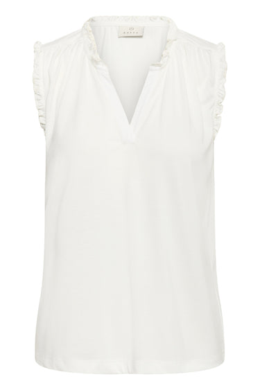 OBS! Fjernlager. Levering kan blive forlænget med 2-3 dage, hvis varen ikke findes i vores butik lige nu.Feminin top fra Kaffe med v-udskæring i halsen og skønne krøllede kanter.