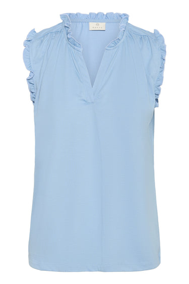 OBS! Fjernlager. Levering kan blive forlænget med 2-3 dage, hvis varen ikke findes i vores butik lige nu.Feminin top fra Kaffe med v-udskæring i halsen og skønne krøllede kanter.