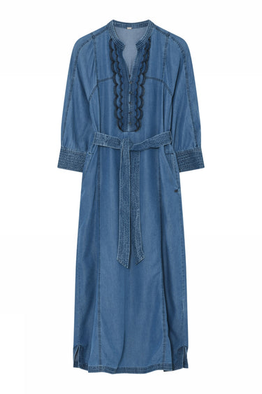 OBS! Fjernlager. Levering kan blive forlænget med 2-3 dage, hvis varen ikke findes i vores butik lige nu.Smart kjole fra Gustav med ¾ lange ærmer, rund hals med v-udskæring og et bredt bindebælte i taljen.Kjolen har også skønne broderet detaljer, lommer i siderne og et smart denim look.