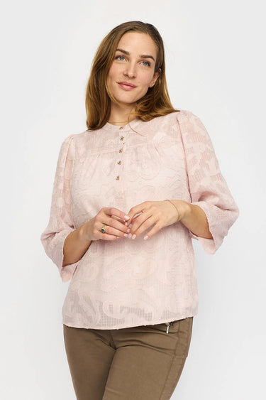 OBS! Fjernlager. Levering kan blive forlænget med 2-3 dage, hvis varen ikke findes i vores butik lige nu.Sød og feminin bluse fra 2-Biz med ¾ lange ærmer, kinakrave i halsen og knaplukning over brystet. Blusen har også en super flot kvalitet og en afslappet silhuet.