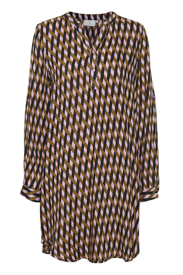 OBS! Fjernlager. Levering kan blive forlænget med 2-3 dage, hvis varen ikke findes i vores butik lige nu.Skøn skjortekjole fra Kaffe med lange ærmer, v-udskæring i halsen og et flot print.