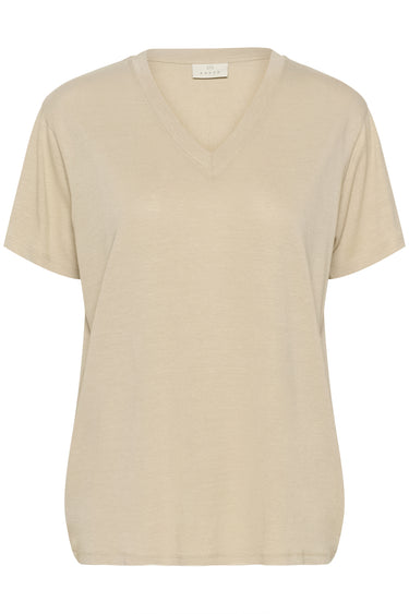 OBS! Fjernlager. Levering kan blive forlænget med 1-2 dage, hvis varen ikke findes i vores butik lige nu.Smart enkel tee fra Kaffe med korte ærmer og v-udskæring i halsen.