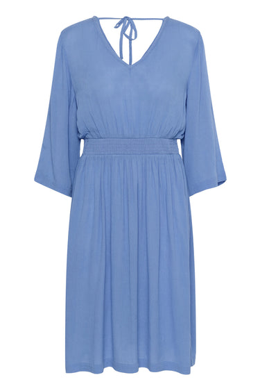 OBS! Fjernlager. Levering kan blive forlænget med 2-3 dage, hvis varen ikke findes i vores butik lige nu.Feminin kjole fra Kaffe med ¾ lange ærmer, v-udskæring i halsen og en bred smockkant i taljen der giver den et flot silhuet.