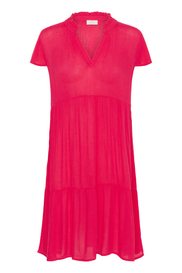 OBS! Fjernlager. Levering kan blive forlænget med 2-3 dage, hvis varen ikke findes i vores butik lige nu.Smuk enkel kjole fra Kaffe med små ærmer, v-udskæring i halsen og brede flæselag i skørtet.