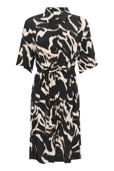 OBS! Fjernlager. Levering kan blive forlænget med 2-3 dage, hvis varen ikke findes i vores butik lige nu.Feminin skjortekjole fra Kaffe med ½ lange ærmer, skjortekrave i halsen og knaplukning langs fronten.Kjolen har også en feminin silhuet og et smalt bindebælte i taljen.