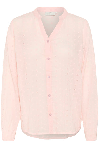 OBS! Fjernlager. Levering kan blive forlænget med 2-3 dage, hvis varen ikke findes i vores butik lige nu.Fin enkel bluse fra Kaffe med lange ærmer, rund hals med v-udskæring og knaplukning langs fronten.