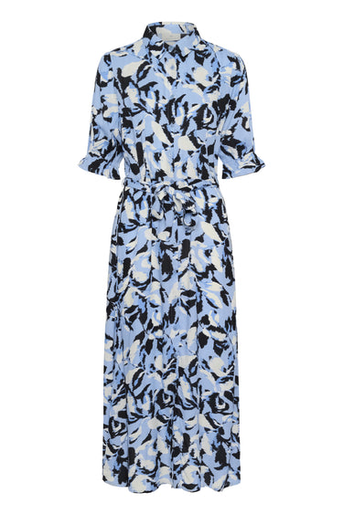 - OBS! Fjernlager. Levering kan blive forlænget med 2-3 dage, hvis varen ikke findes i vores butik lige nu.Flot kjole fra Kaffe med ½ lange ærmer, skjortekrave i halsen og et bredt bindebånd i taljen. Kjolen har også små flæsedetaljer i bunden af ærmerne, knaplukning langs fronten og et super flot print.