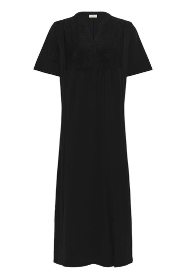 OBS! Fjernlager. Levering kan blive forlænget med 2-3 dage, hvis varen ikke findes i vores butik lige nu.Enkel kjole fra Kaffe med ½ lange ærmer, et lige snit og super fine broderi anglaise detaljer omkring brystet.