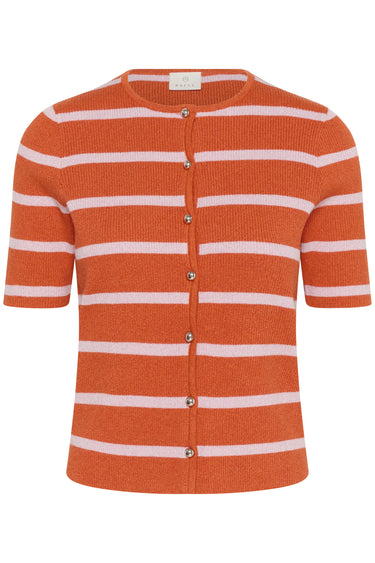 OBS! Fjernlager. Levering kan blive forlænget med 2-3 dage, hvis varen ikke findes i vores butik lige nu.Super sød strik fra Kaffe med korte ærmer, rund hals og fine knapper langs fronten.Strikken har også en let tætsiddende pasform og fine glimmereffekter.