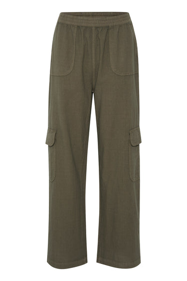 OBS! Fjernlager. Levering kan blive forlænget med 2-3 dage, hvis varen ikke findes i vores butik lige nu.Smarte cargo bukser fra Kaffe med en bred elastikkant i taljen, klassiske utility-inspireret lommer i siderne og en afslappet silhuet.