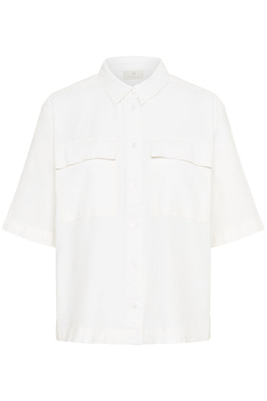 OBS! Fjernlager. Levering kan blive forlænget med 2-3 dage, hvis varen ikke findes i vores butik lige nu.Smart skjortebluse fra Kaffe med ½ lange ærmer, en lille krave i halsen og knaplukning langs fronten.