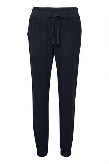 OBS! Fjernlager. Levering kan blive forlænget med 2-3 dage, hvis varen ikke findes i vores butik lige nu.Lækre bukser fra Kaffe med en bred elastikkant og bindesnor i taljen, elastikkanter i bunden af benene og dybe lommer i siderne. Bukserne har også en dejlig blød kvalitet og en afslappet pasform.
