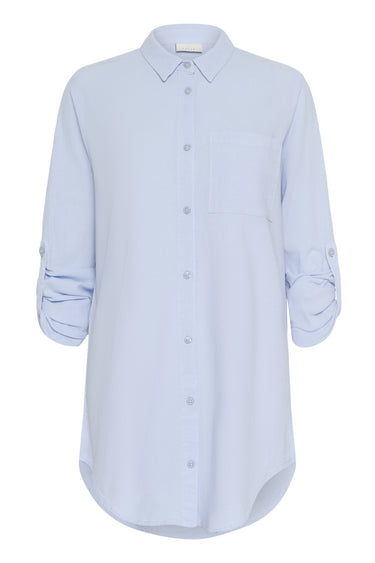 OBS! Fjernlager. Levering kan blive forlænget med 2-3 dage, hvis varen ikke findes i vores butik lige nu.Smart tunika fra Kaffe med lange ærmer, en lille krave i halsen og en fin lomme på brystet.Tunikaen har også afrundede kanter, en afslappet pasform og knaplukning langs fronten.