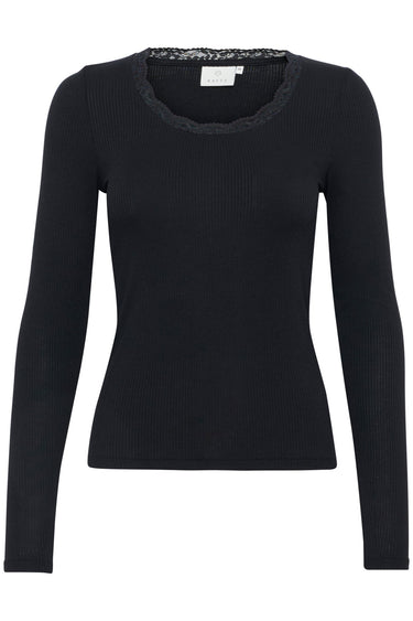 OBS! Fjernlager. Levering kan blive forlænget med 2-3 dage, hvis varen ikke findes i vores butik lige nu.Feminin slim-fit top fra Kaffe med lange ærmer, rund hals med en lille blondekant og en dejlig blød kvalitet.