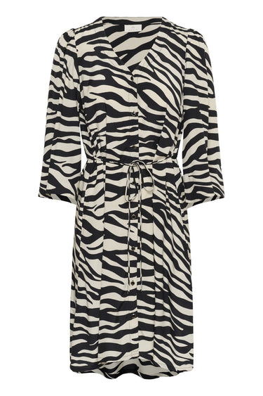 - OBS! Fjernlager. Levering kan blive forlænget med 2-3 dage, hvis varen ikke findes i vores butik lige nu.Fin kjole fra Kaffe med ¾ lange ærmer, v-udskæring i halsen og et smalt bindebælte i taljen.Kjolen har også et feminint snit og et skønt print.