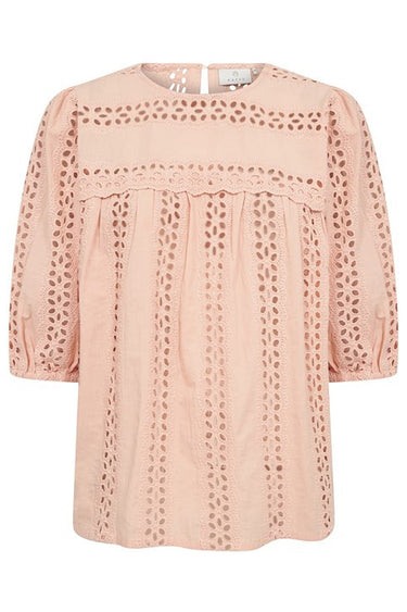 OBS! Fjernlager. Levering kan blive forlænget med 2-3 dage, hvis varen ikke findes i vores butik lige nu.Sød broderi anglaise bluse fra Kaffe med ¾ lange ærmer, rund hals og smukke broderet detaljer.